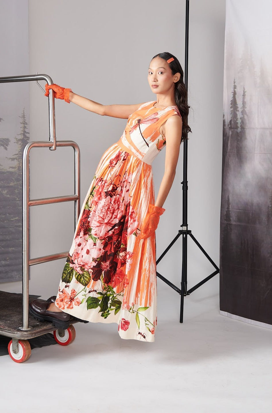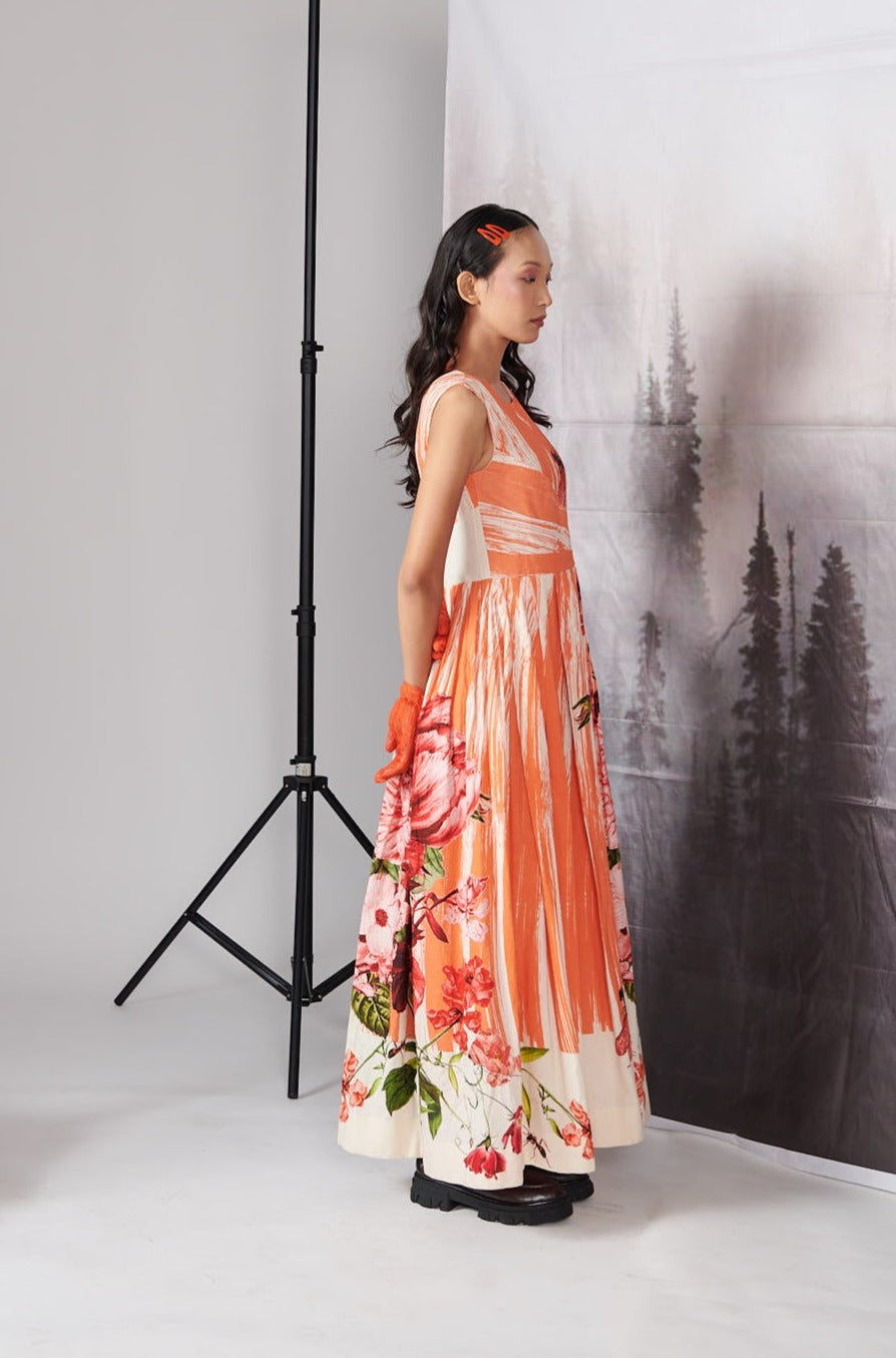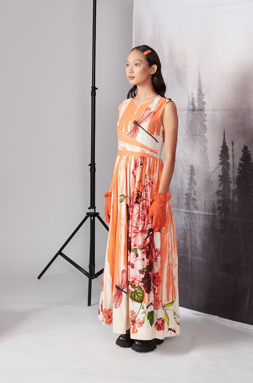 The Orange Scratch Print Dress is a sophisticated and contemporary addition to any wardrobe, adding a vibrant burst of color. With its unique scratch print design in a bold orange hue, this full-length garment radiates modern elegance and innovation. Perfect for both casual outings and formal occasions, its sleeveless design offers versatility and flair, making it an ideal choice for those seeking to make a stylish statement with ease.